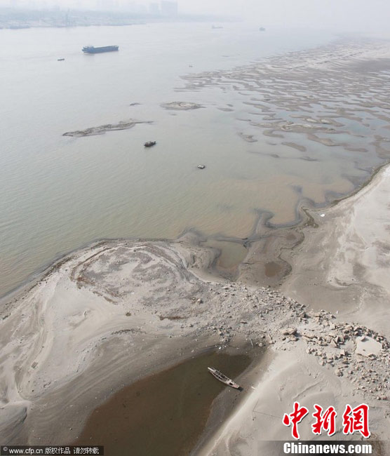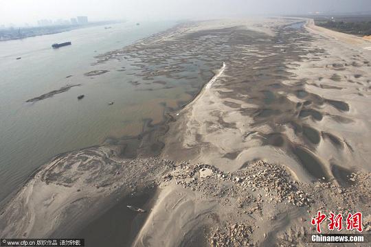 12月7日,在長江武漢市天興洲水域,大(dà)量沙洲露出江麵,形成大大小(xiǎo)小的沙(shā)丘,分布在水岸。據悉,近期,由(yóu)於長江中下遊地區持(chí)續多日的幹燥少雨的天氣,長江(jiāng)漢口水位接近枯(kū)水期的標植。