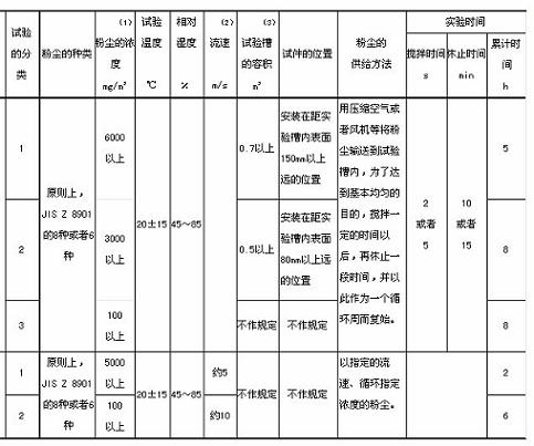 注 (1)所(suǒ)謂粉塵的“濃度”,是指粉塵在試驗槽內擴散到(dào)基本穩定狀態(tài)時的值(zhí)。 (2)氣(qì)流的流速,在試件附近進(jìn)行測定。 (3)試驗槽的容積規(guī)定為有效試驗空(kōng)間。