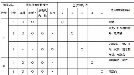 5. 適用基準 塵(chén)埃試驗的適用基準(zhǔn),按照零部件所處環(huán)境及零部件的使用部位進行分類,原則上如表3所示。 附(fù)注 表中帶(dài)有圓圈符(fú)號“○”的欄目,表示(shì)適用的場合。 6、評價 按照“4.”進(jìn)行(háng)試驗,檢查零(líng)部(bù)件的品質、性能以及粉塵的侵入程度。 JIS D 0207-1997 汽車零部件的防塵及耐塵試驗通則解說